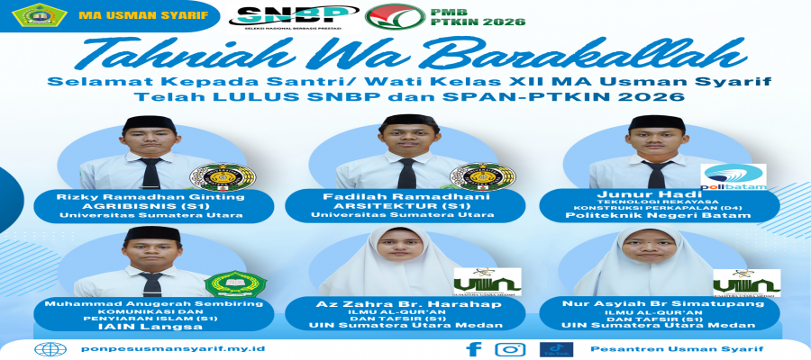 ✨ Tahniah wa Barakallah ✨Selamat dan sukses kepada santri/wati Kelas XII MA Usman Syarif yang telah LULUS SNBP & SPAN-PTKIN 2026 ✨ Kami bangga atas